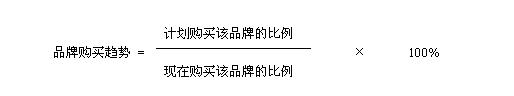 以將來計劃購買目標企業(yè)品牌或競爭企業(yè)品牌的比例,除以現(xiàn)在購買該企業(yè)品牌的比例,得出消費者購買各企業(yè)品牌的趨勢,該數(shù)值以分值表示,分值大于1,表示消費者的購買趨勢在增強;分值小于1,表示消費者的購買趨勢在減弱。