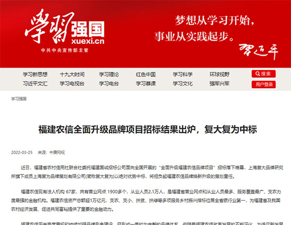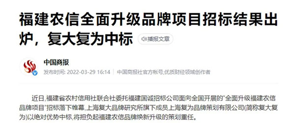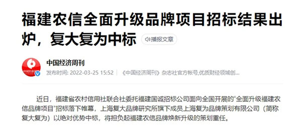 近日,學習強國、光明網(wǎng)、中國經(jīng)濟周刊、金融界等權威媒體集中報道了福建農(nóng)信全面升級品牌項目招標結果,介紹了“全面升級福建農(nóng)信品牌項目”的重要意義,對擔任策劃重任的復大復為給予了極大關注。
