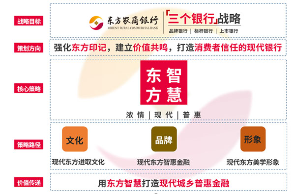 明確品牌核心價(jià)值所在后,項(xiàng)目組將東方農(nóng)商銀行的文化融入到品牌打造中,選取了“東方”“智慧”作為撬動客戶心智的橋梁,制定了品牌策略:客戶價(jià)值感知為導(dǎo)向,強(qiáng)化東方品牌印記,進(jìn)行品牌價(jià)值傳遞,烙印打造現(xiàn)代銀行的品牌感知。