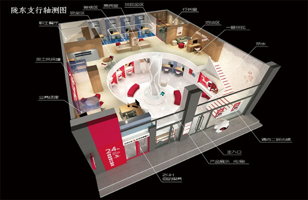 銀行營業(yè)空間是銀行運(yùn)營的主要功能場所,是銀行與客戶接觸的第一空間,也是銀行展示自身文化、品牌、服務(wù)的主要窗口,設(shè)計(jì)時必須綜合考慮舒適、安全、便利、人文關(guān)懷等因素;空間盡量寬闊舒適,色調(diào)要穩(wěn)重高雅,材料要耐磨易清理,標(biāo)語提示要醒目易懂,動線規(guī)劃合理方便等。