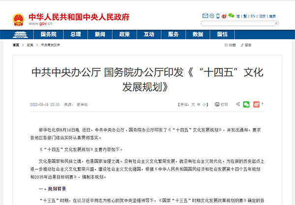 近日,中共中央辦公廳、國務院辦公廳近日印發(fā)《“十四五”文化發(fā)展規(guī)劃》(以下簡稱《規(guī)劃》)?!兑?guī)劃》系統(tǒng)謀劃“十四五”時期文化發(fā)展的重點目標任務、重要政策舉措和重大工程項目。其中包括強化文化賦能,充分發(fā)揮文化在激活發(fā)展動能、提升發(fā)展品質(zhì)、促進經(jīng)濟結(jié)構優(yōu)化升級中的作用;堅持以文塑旅、以旅彰文,推動文化和旅游在更廣范圍、更深層次、更高水平上融合發(fā)展,打造獨具魅力的中華文化旅游體驗,以及充分發(fā)揮文化傳承功能全面推進鄉(xiāng)村文化振興等。