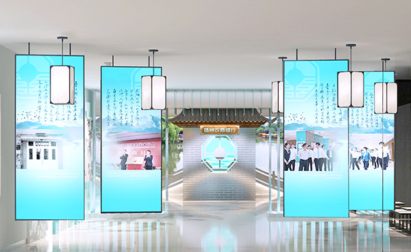 運(yùn)用揚(yáng)州文化的經(jīng)典元素如清曲、石橋、飛檐、屏風(fēng)、卷軸等,讓行史館整體設(shè)計(jì)變化更豐富,避免呆板布局,凸顯揚(yáng)州農(nóng)商銀行的歷史文化底蘊(yùn),讓參觀者更有代入感。