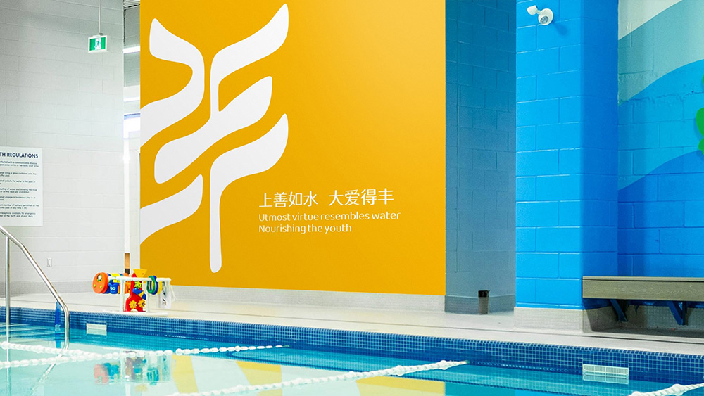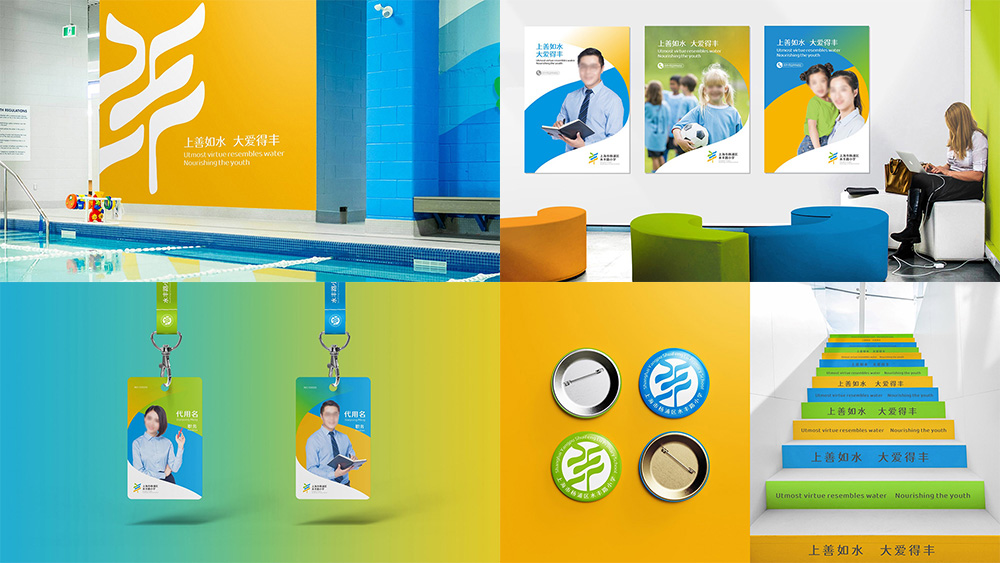 標準色是傳達品牌理念和特點的主要視覺元素。項目組在設(shè)計時采用大面積的標準色作為背景,通過和諧而漸進的色彩變化,形成強烈的視覺沖擊,從而突出品牌特色。同時,使用柔和的線條來搭配色塊構(gòu)圖,呈現(xiàn)出流水彎彎曲曲的模樣,增加了視覺層次感和變化,使整個視覺形象更加生動和有趣。品牌形象呈現(xiàn)不僅更加吸引眼球,也體現(xiàn)了水豐小學“上善如水,大愛得豐”的理念。