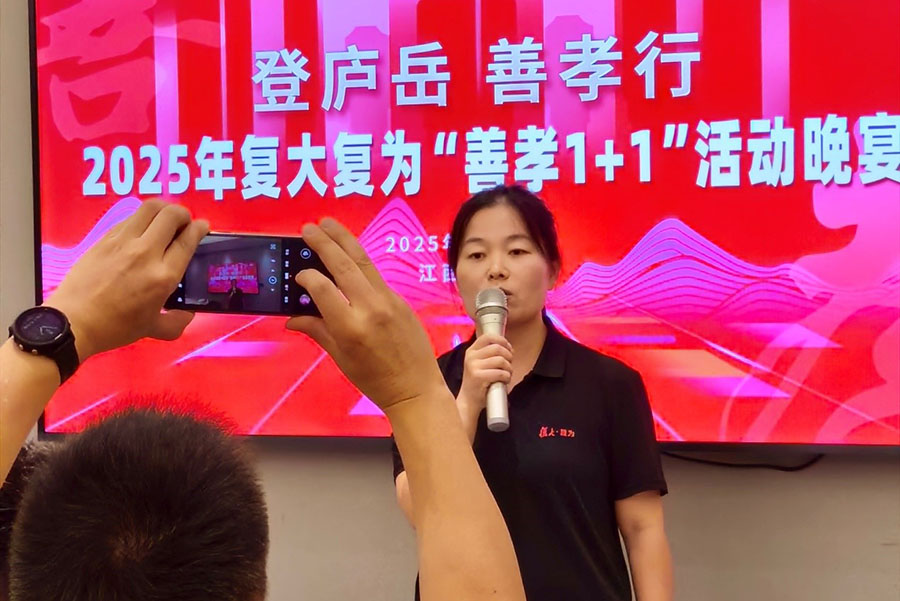 晚上,“善孝1+1” 行動儀式在中共廬山會議舊址側(cè)翼薇酒店舉行。儀式由集團(tuán)副總裁趙文濤主持,流程緊湊且意義深刻。首先,播放復(fù)為“善孝1+1”VCR,通過真實畫面溫故十四年的善孝行動歷程,直觀展現(xiàn)了行動的核心價值與實踐成果。隨后,陳云勇博士講話,對優(yōu)化后的集團(tuán)新理念和未來的發(fā)展構(gòu)想作了簡要陳述,同時分享了參訪白鹿洞書院的感想,強調(diào)“善孝1+1”是企業(yè)發(fā)展的重要文化支撐。財務(wù)總監(jiān)周?;巯虼蠹覅R報“善孝款”發(fā)放和各位員工父母收訖反饋的情況,用數(shù)據(jù)印證了“善孝1+1”的親情傳遞與情感價值。