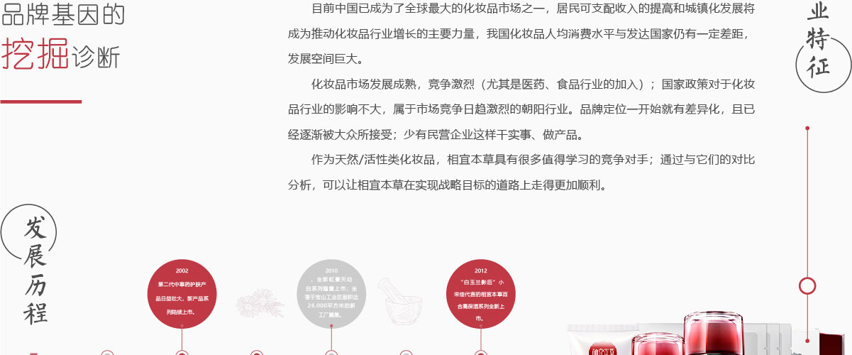相宜本草,經(jīng)過10余年的發(fā)展與積累,已經(jīng)在國內(nèi)確立起“草本化妝品第一品牌”的形象,目前正處于快速發(fā)展與規(guī)模壯大期。要成為行業(yè)內(nèi)知名集團(tuán)品牌,必須精準(zhǔn)規(guī)劃,全面提升自己的整體品牌形象,達(dá)到統(tǒng)一的、具有傳播力的視覺效果。相宜本草必須注意品牌形象創(chuàng)新意識、客戶視覺印象等的培養(yǎng)和提升,在發(fā)展中完善品牌形象的系統(tǒng)性設(shè)計,實現(xiàn)持續(xù)、健康、穩(wěn)定的成長。